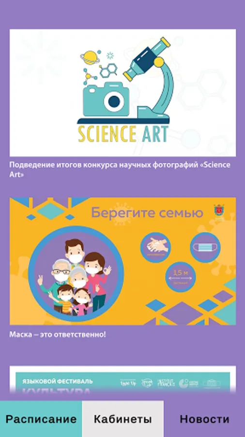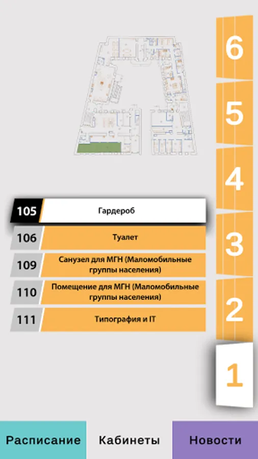 Informational app for students. Contains navigation through the educational institution, class schedule and news.