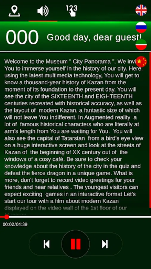 Welcome to the Museum " City Panorama ". We invite You to immerse yourself in the history of our city. Here, using the latest multimedia technology, You will get to know a thousand-year history of Kazan from the moment of its foundation to the present day. You will see the city of the SIXTEENTH and EIGHTEENTH centuries recreated with historical accuracy, as well as the layout of modern Kazan, a fantastic size of which will not leave You indifferent. In Augmented reality a lot of famous historical characters who are literally at arm's length from You are waiting for You.
