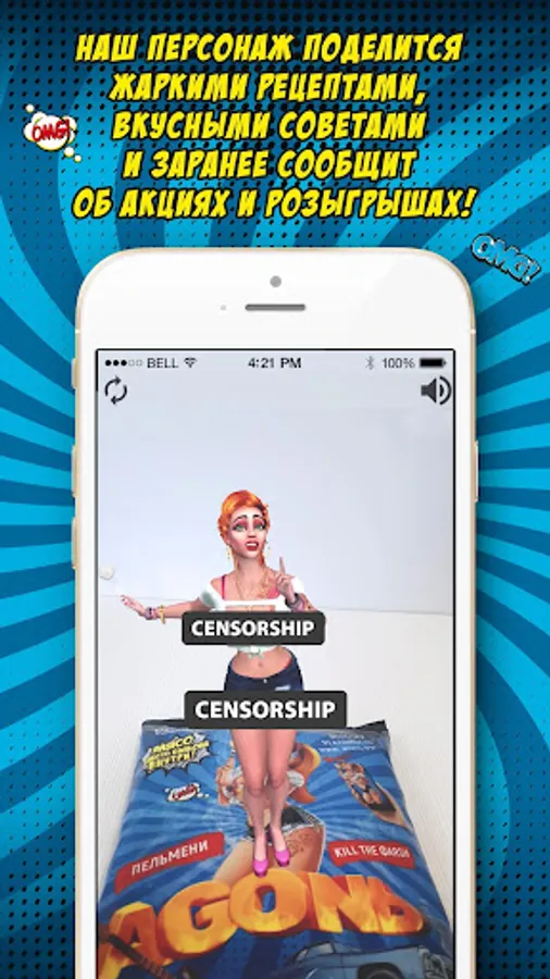 The animation is available only for the ZATOCHIM ravioli series (blue packaging with a red girl), LOLA (yellow packaging with a blonde) and KILL THE FARSH (purple packaging with a red girl). A 3D character from the FAKULTET series (red packaging with a dark-haired girl) is in development.