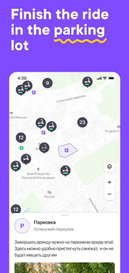 Service is available in Moscow, St. Petersburg, Kazan, Khabarovsk and the largest cities in the South of Russia, such as Sochi, Krasnaya Polyana, Anapa, Krasnodar, Rostov-on-Don and others. The rental rules may differ for each city, so we recommend checking them before renting. In general, sharing is similar to Whoosh, Eleven, Molnia, Lite, Poputi, Busyfly, YES Sharing, Lime, Bird, Dott, Voi, Tier, Circ and others.