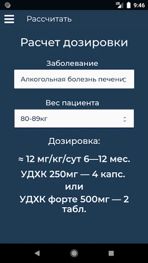 Ursocalculator is an application that will help you quickly and accurately select the dosage of UDCA drugs of various dosage forms, depending on the patient's weight. You no longer need to count capsules and pills, remember the regimen - just enter the patient's nosology and weight and the application will tell you the recommended dose in accordance with the drug's instructions.