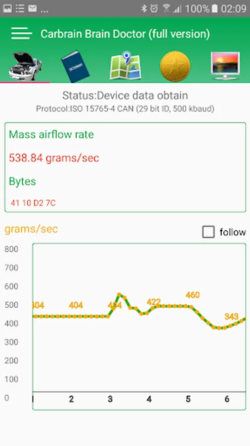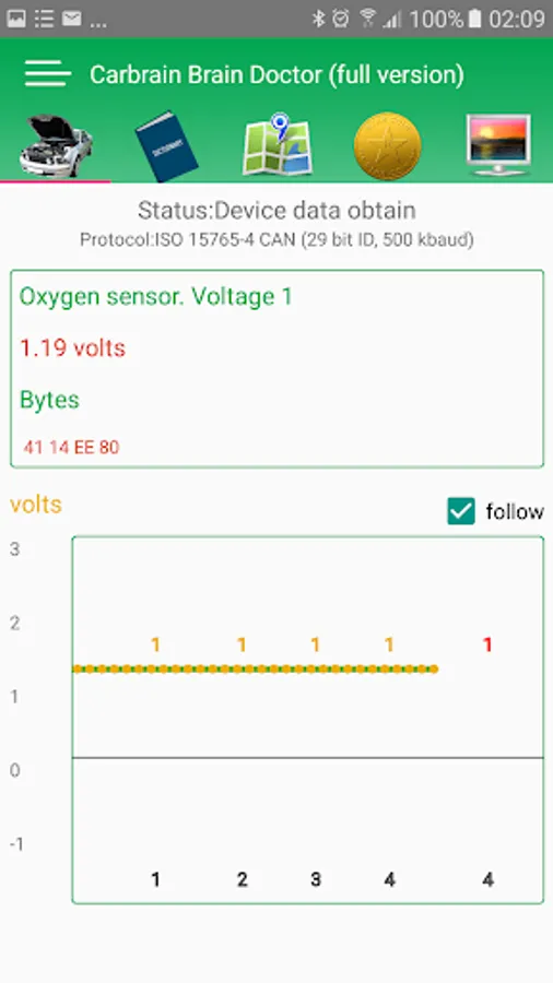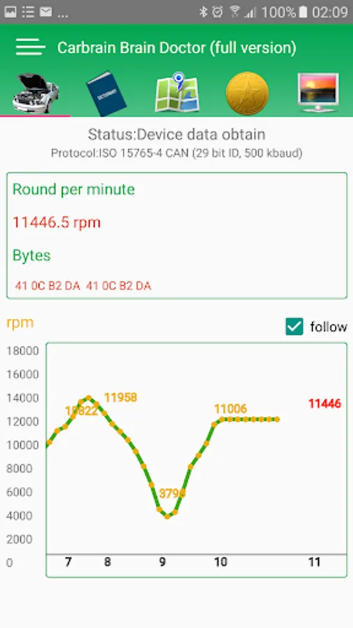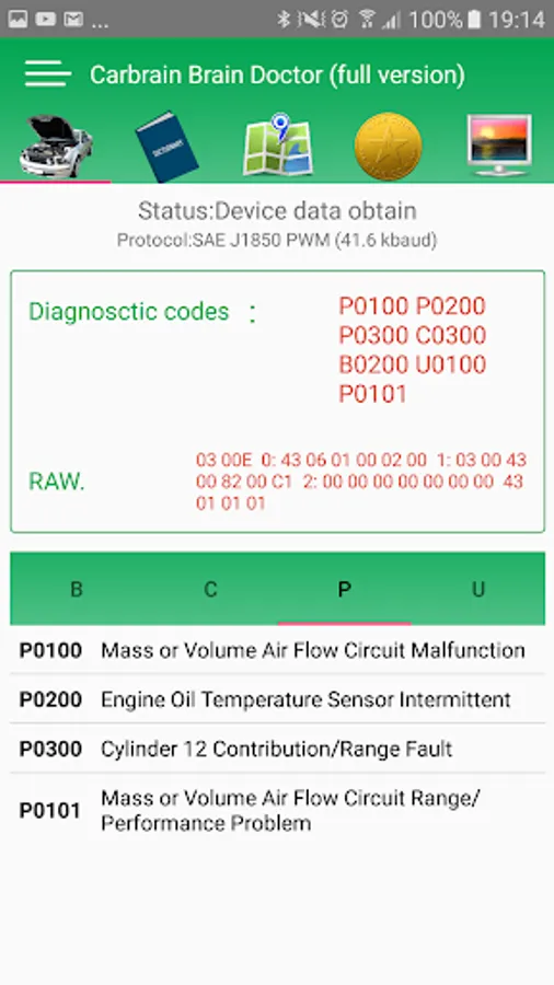 1. Application makes connection with car OBD adapter via bluetooth and displays received car diagnostics information.
