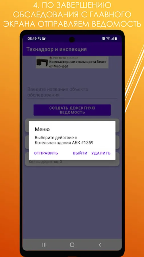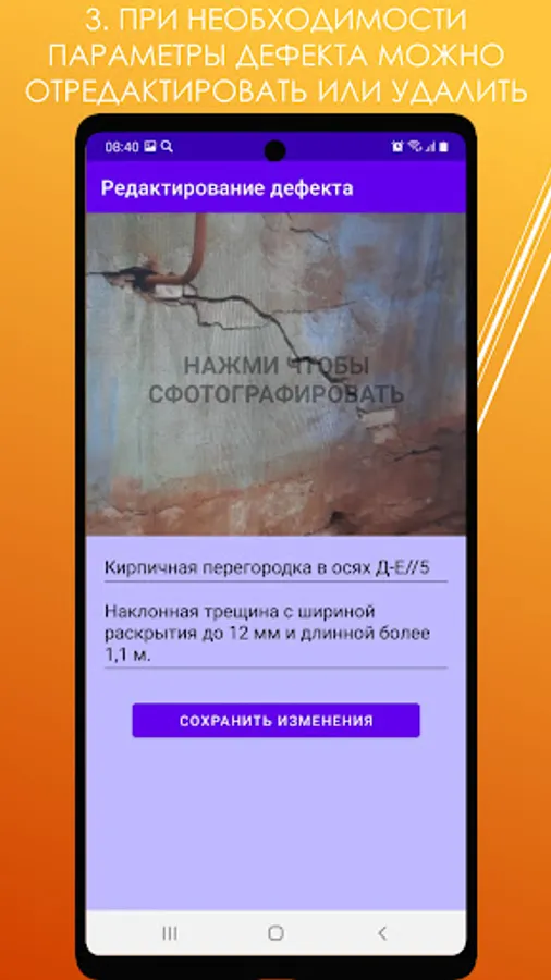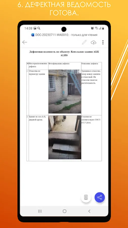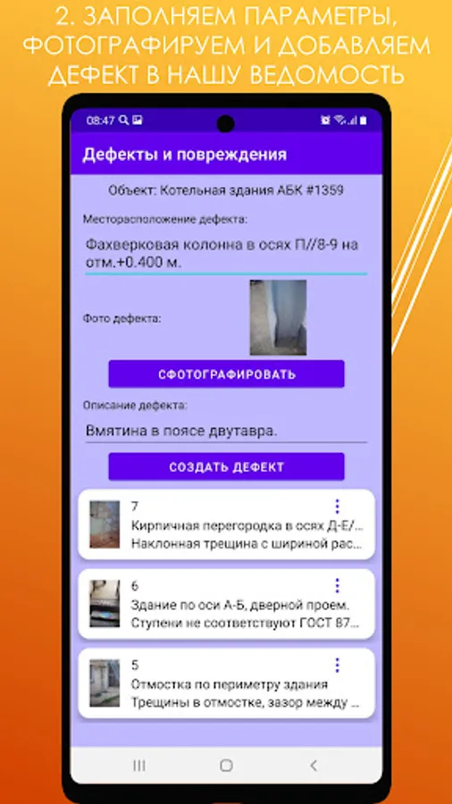 Technical supervision and inspection is a convenient application aimed at quickly generating a defective statement based on the results of a survey of buildings and structures, diagnosing technical devices, conducting field supervision, expert evaluation of an object or car, inspecting a construction site, building control, checking for compliance with the project and sending a defective statement to .docx format by email, whatsapp, telegram and any other means. The "Technical Supervision and Inspection" application completely replaces the camera and pencil and paper, as it allows you to take pictures and indicate the location of the identified non-conformities with their description. This application will become the best assistant for technical supervision engineers, inspectors of RosTechNadzor, designers who carry out field supervision and control of the construction of an object at the construction site.