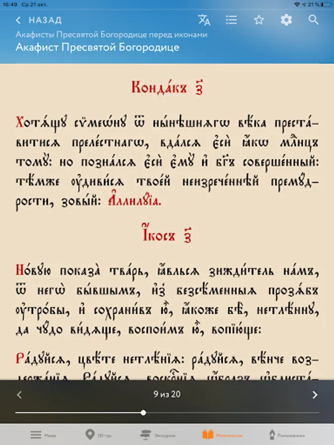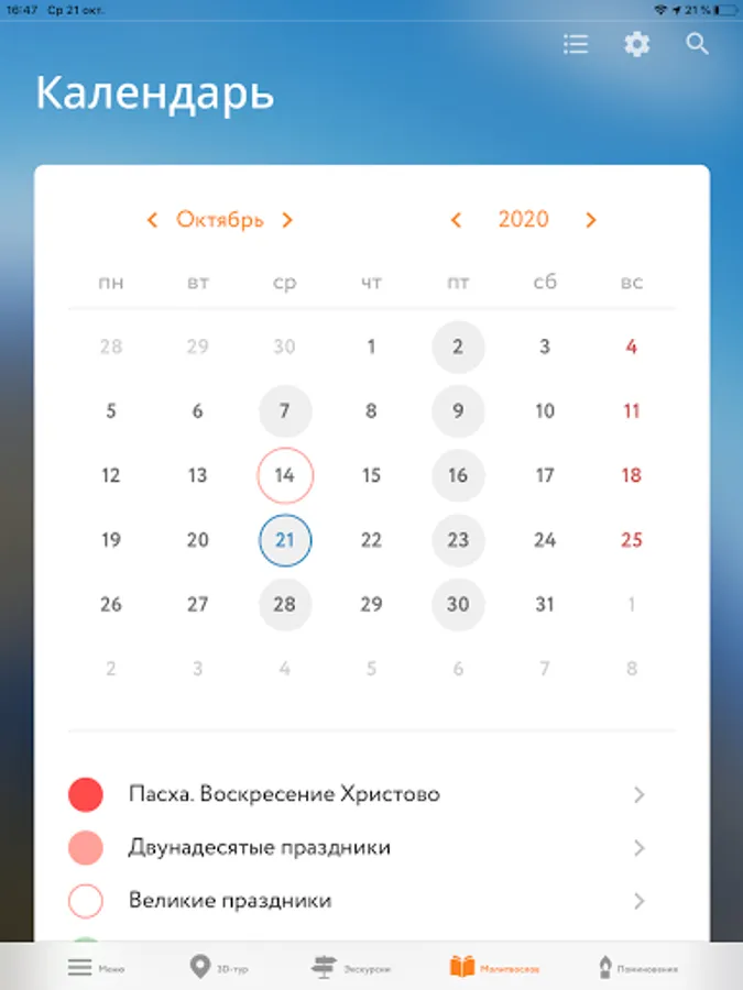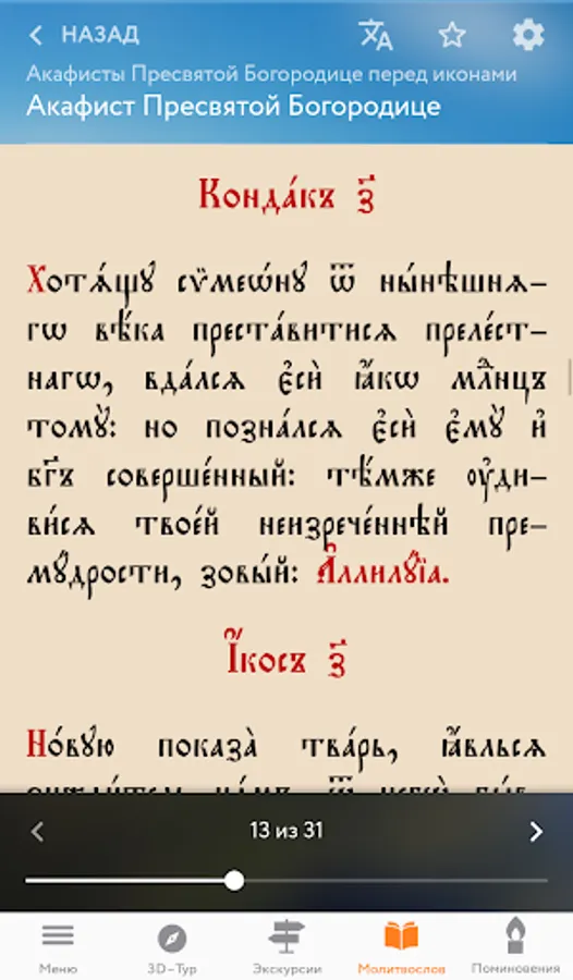 One of the main sections of the application is the complete Orthodox prayer book, which includes not only morning and evening prayers, but also the Bible, Psalms, akathists, canons and all kinds of petitions to the Lord and the Mother of God for different occasions. The texts are presented in two versions, in Russian and Church Slavonic. It also contains a unique database of liturgical texts that will be useful to clergy, readers, singers, instructors and regents. Also in the application, along with the prayer book, the Orthodox calendar is very conveniently integrated, containing the usual information about the holidays and a short soulful word for every day.