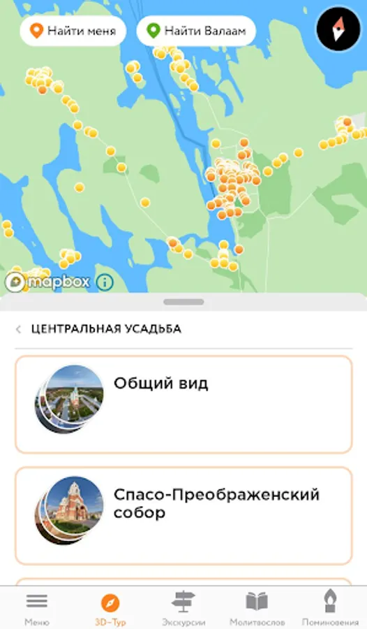 The guide is geotagged to the territory of the Valaam archipelago, and at any time you can determine your position on the island and understand what nearby objects you would like to see or visit.