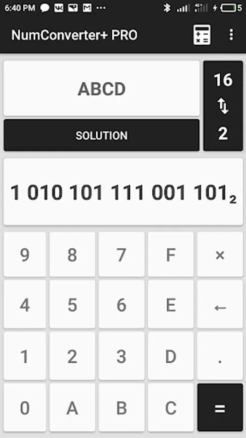 NumConverter + PRO is the application for the convertation of numbers from one numeral system to another, as well as to calculate the sum, difference, dividing and multiplication of two different numbers with different base numeral systems.