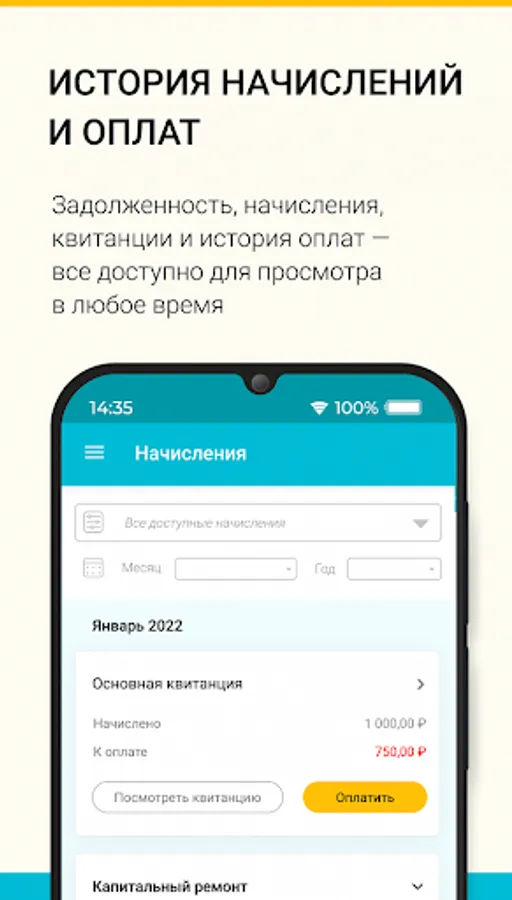 • Viewing the current receipt for housing and communal services and overhaul with a decoding of the calculation items.