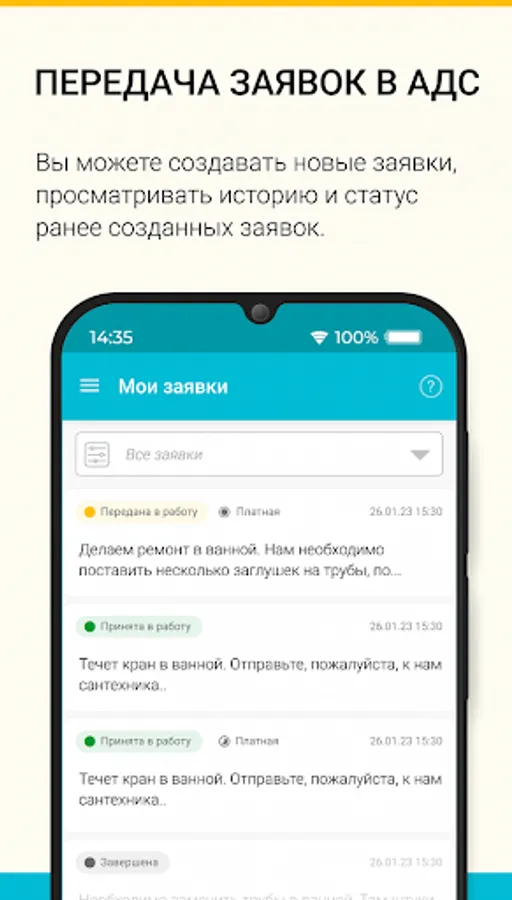 • Creation of a new application to the Dispatching Service of Housing and Public Utilities, cancellation of the previously submitted one and acceptance of work on the completed application. View the history and status of previously created requests.