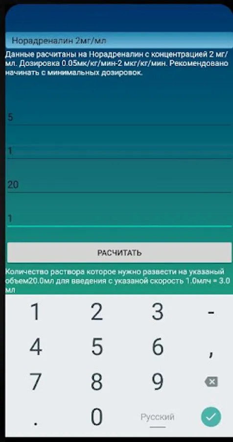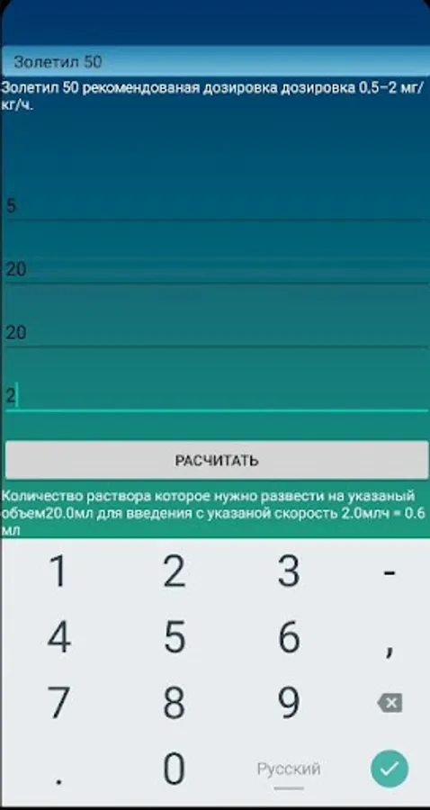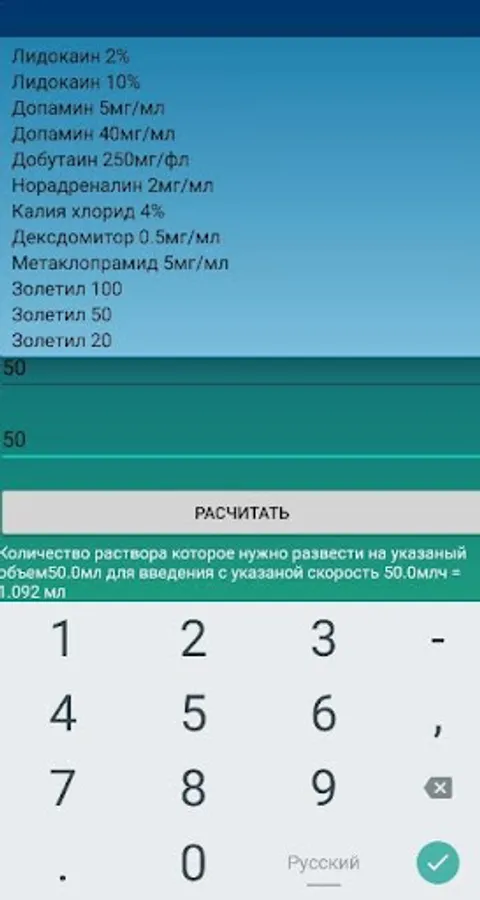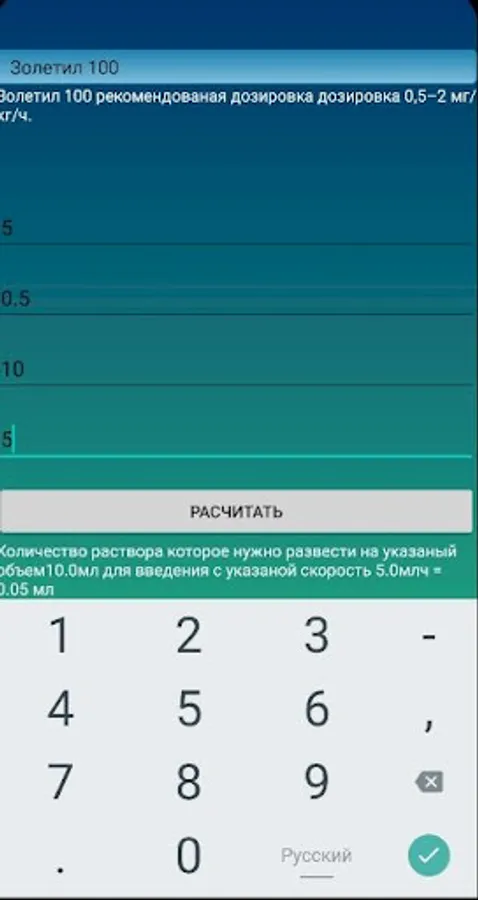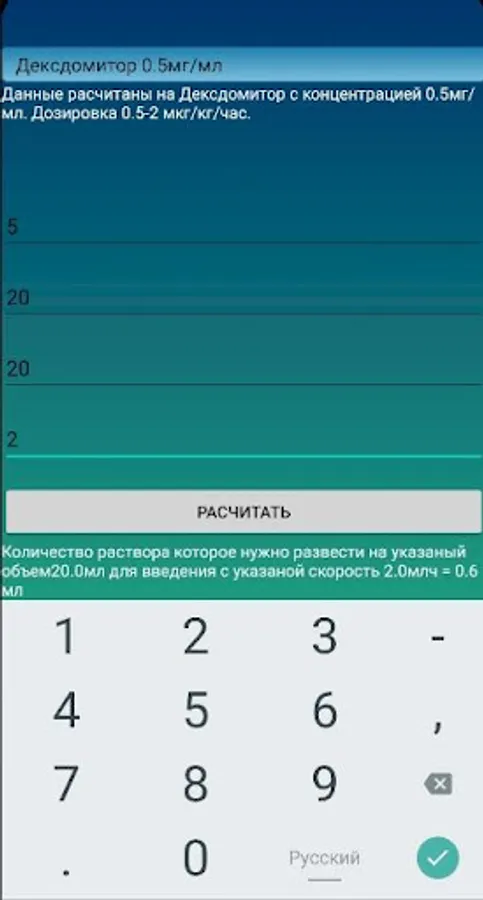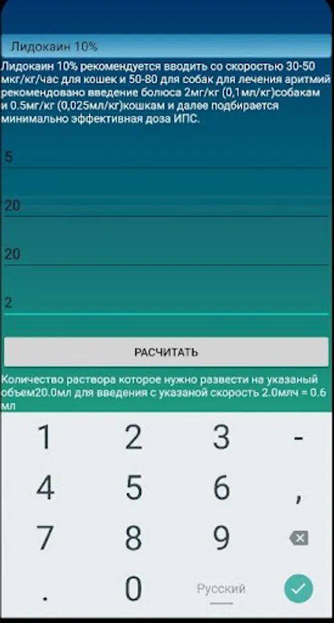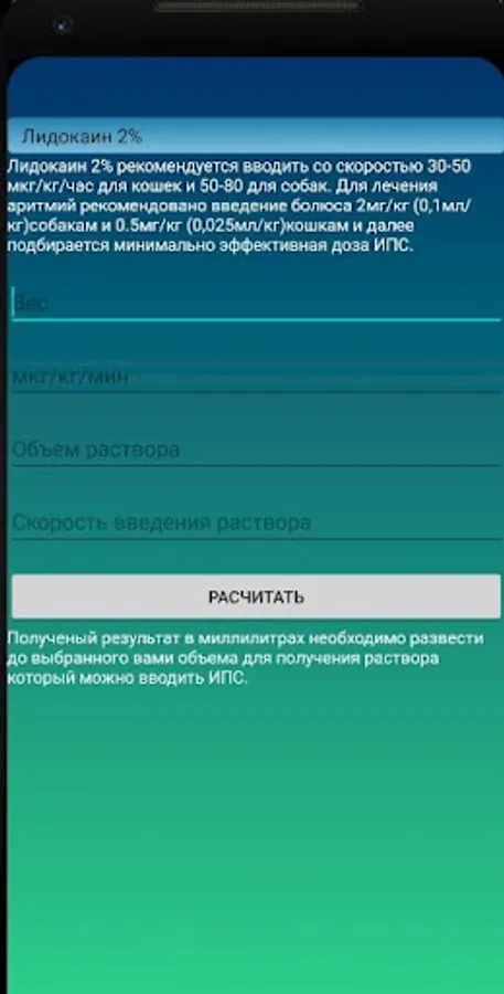 To use this application, you must select a drug from the list, indicate the weight of the animal, the rate of administration of the active substance (it is highly recommended not to exceed the doses indicated in the recommendations), the volume by which the preparation is to be diluted and the rate of administration (it is recommended to use the rate of administration multiple of the selected rate of administration of the active substance) .