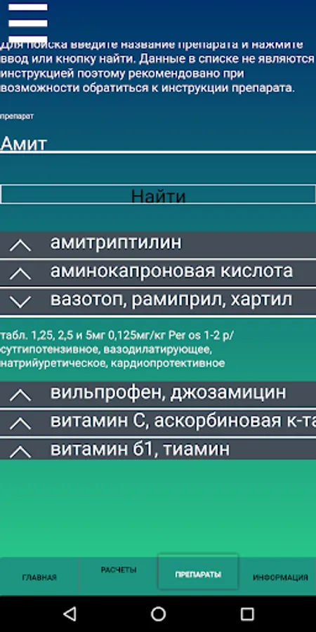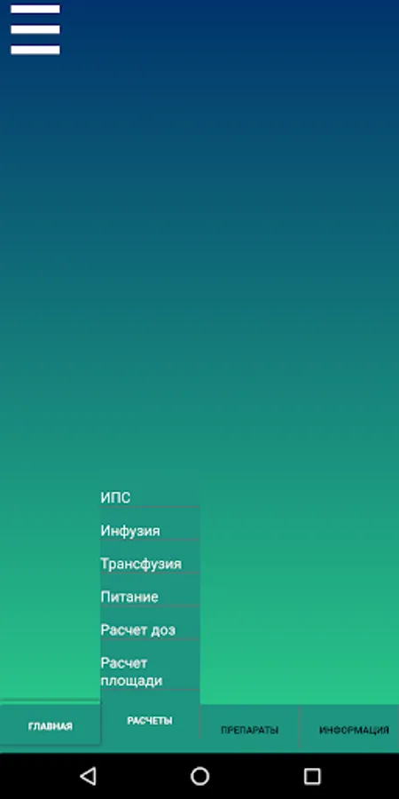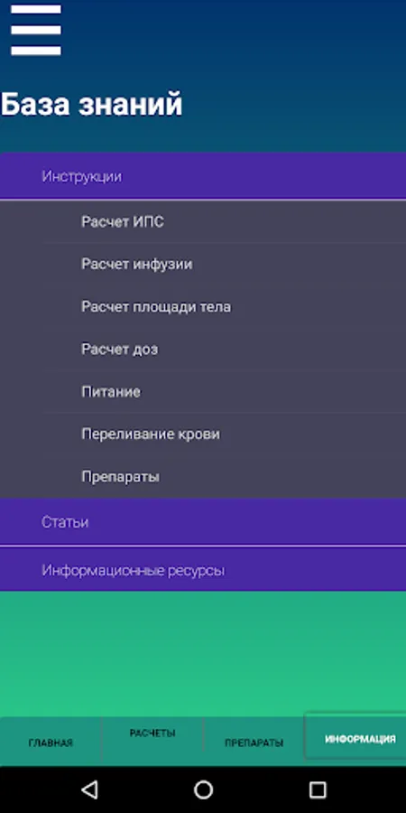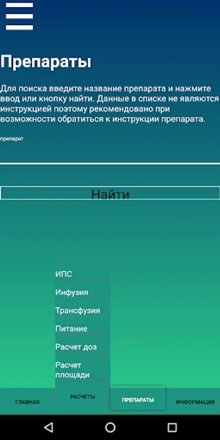 This application allows you to calculate the volume of infusion, the rate of administration of drugs at a constant rate, parenteral and enteral nutrition,