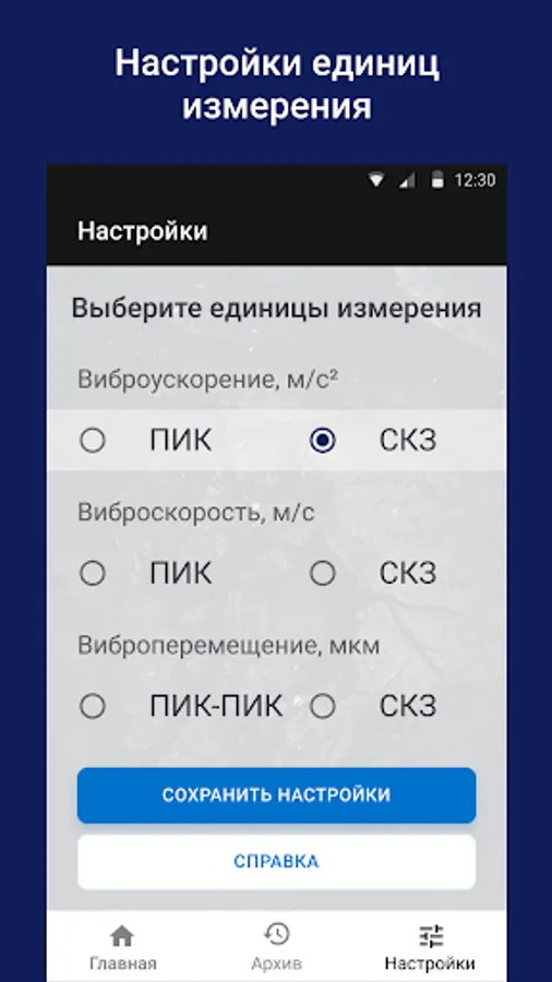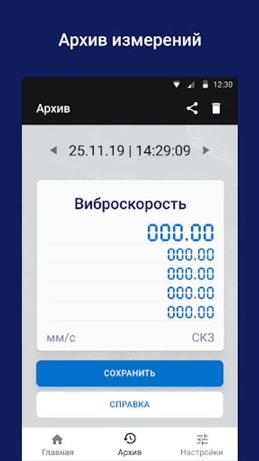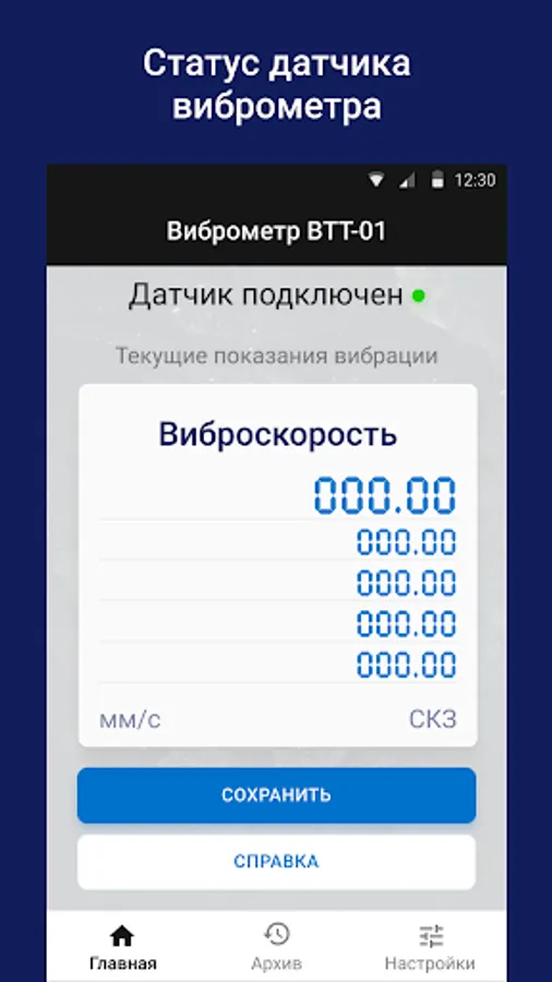The VTT-01 Vibrometer application works only with a vibration sensor which is connected to an Android device and is designed to measure various vibration parameters at different points of industrial equipment (pumps, electric motors, compressors) with the ability to save readings to the archive.