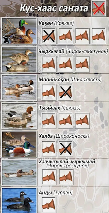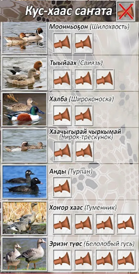 The voices of the most common ducks and geese are gathered in a quick, easy application. High-quality voices, intuitive interface. In the appendix are the voices of the mallard, the teal-whistle, the pintail, the squirrel, the wide-nosed, the teal-cracker, the turpan, the goose of the goose and the white-fronted goose.