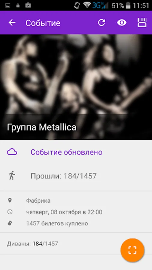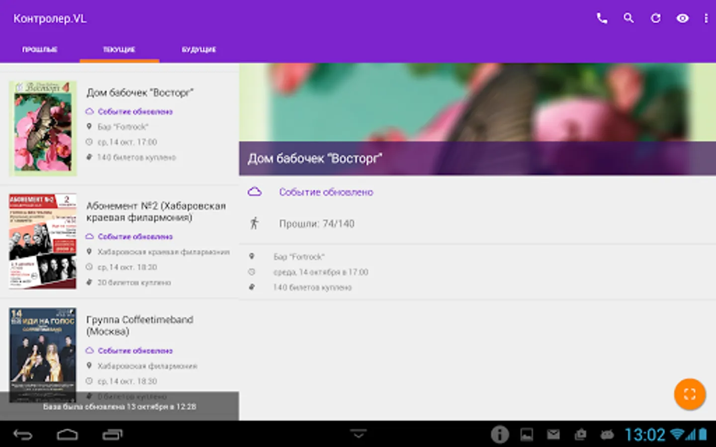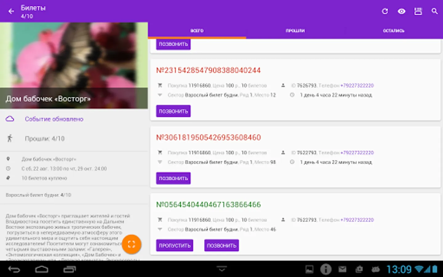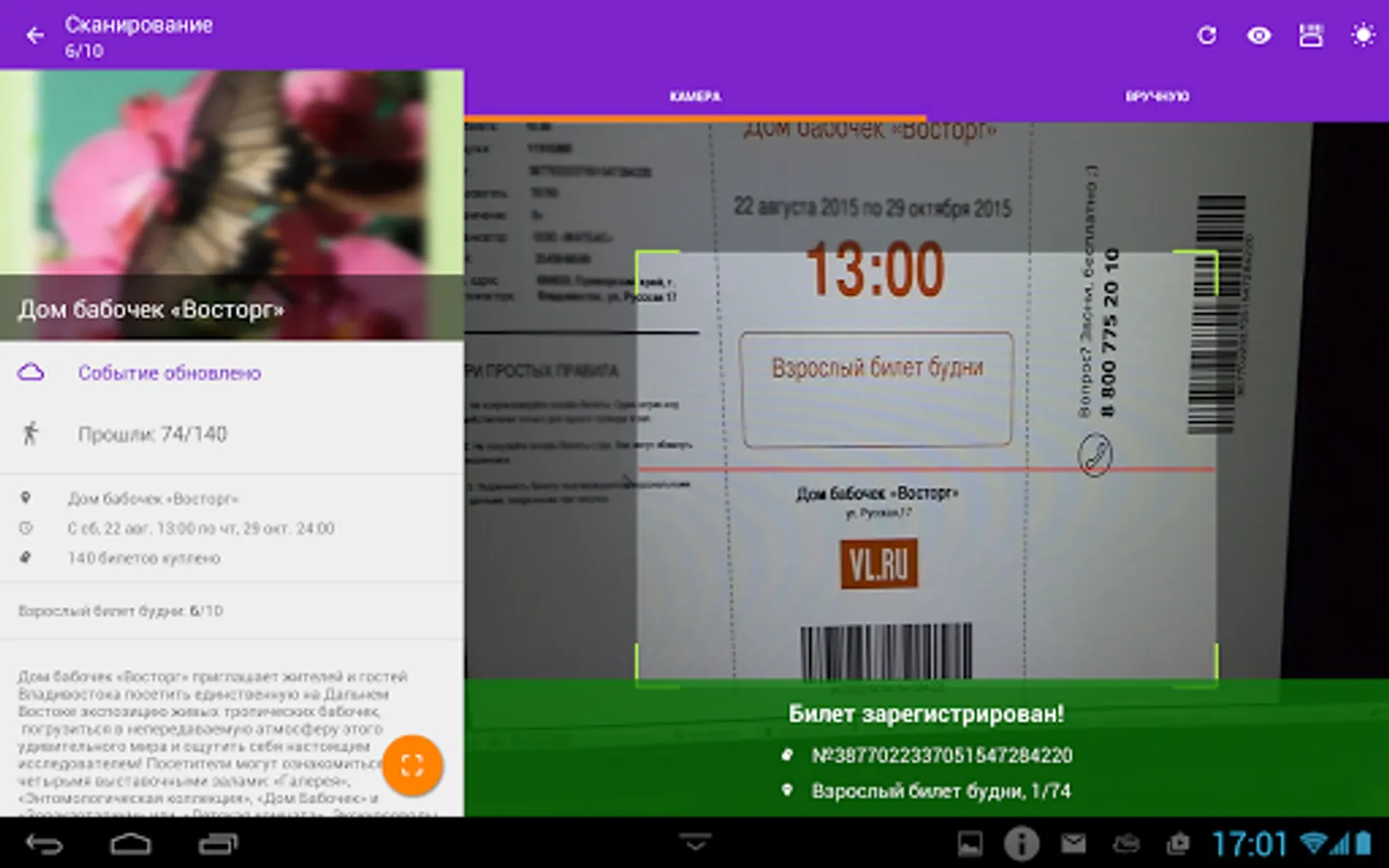 The application solves the problem of missing visitors to events with electronic tickets: Print (barcode scans) and unopened (search by number of purchase / ticket).
