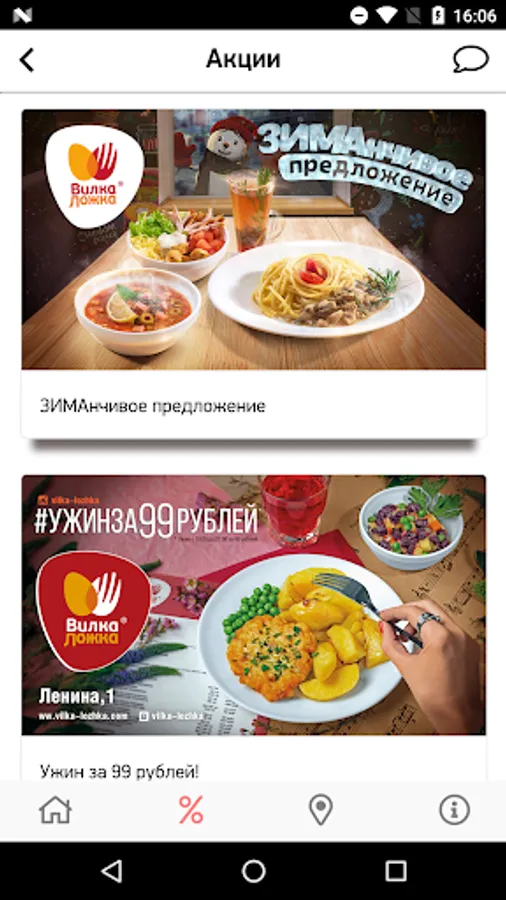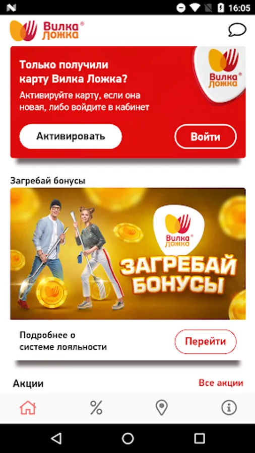 The application Fork Spoon will allow you to monitor your bonus account and control expenses. To do this, you need to purchase a card and register it in the application. Save bonuses and pay them orders, 1 bonus = 1 ruble. Get 5% bonus points for registration. The greater the amount of the calculation, the greater the discount next month.