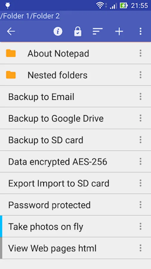 ENCRYPTION: Notepad uses the military grade encryption AES 256 to encrypt your private notes. AES 256 encryption is approved by NSA for keeping top secret files.