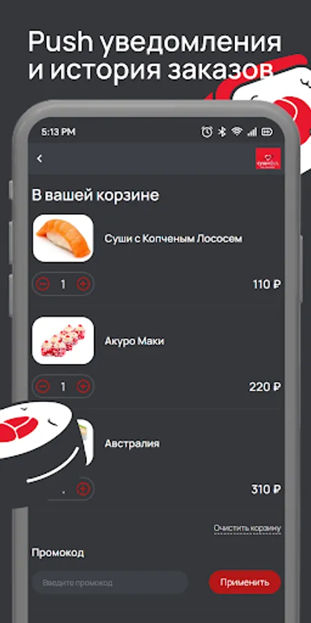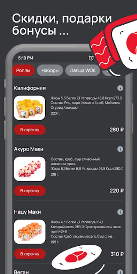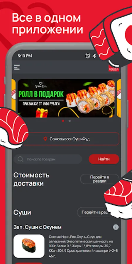 СушиФуд - это популярные магазины быстрого питания с доставкой на дом в более чем 35 городах России. Установите приложение "Суши Фуд". Делайте заказы быстро и удобно. Копите баллы и обплачивайте ими заказы. Рекомендуйте приложение друзьям, вступайте в наши группы и получайте ещё больше бонусов. Приложение "Суши Фуд" - это удобный интерфейс, актуальное меню, информация об акциях и конечно много подарков. Заказывайте любимые суши и роллы в один клик! Это быстро, удобно и очень вкусно!