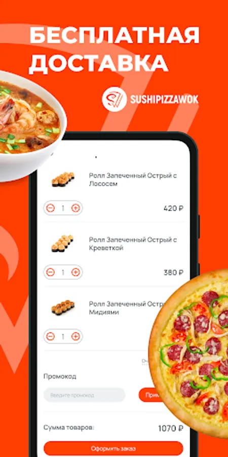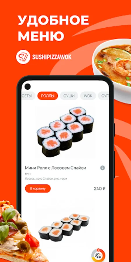 Are you hungry and there is no time to cook? SUSHIPIZZAWOK is a service with which you can order fast food delivery: pizza, sushi, rolls, wok, soups, salads, snacks and drinks.
