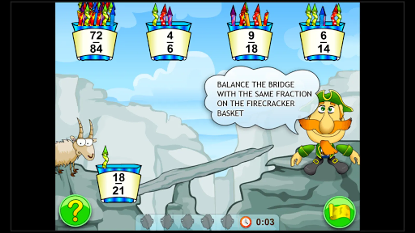 On the second island, the pirates have to get across the bottomless abyss. In order to do it, they should balance the bridge using firecracker baskets. In this game the player assists the pirates in choosing a basket with an equivalent fraction.