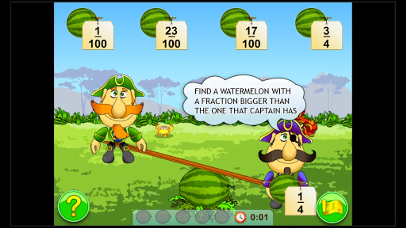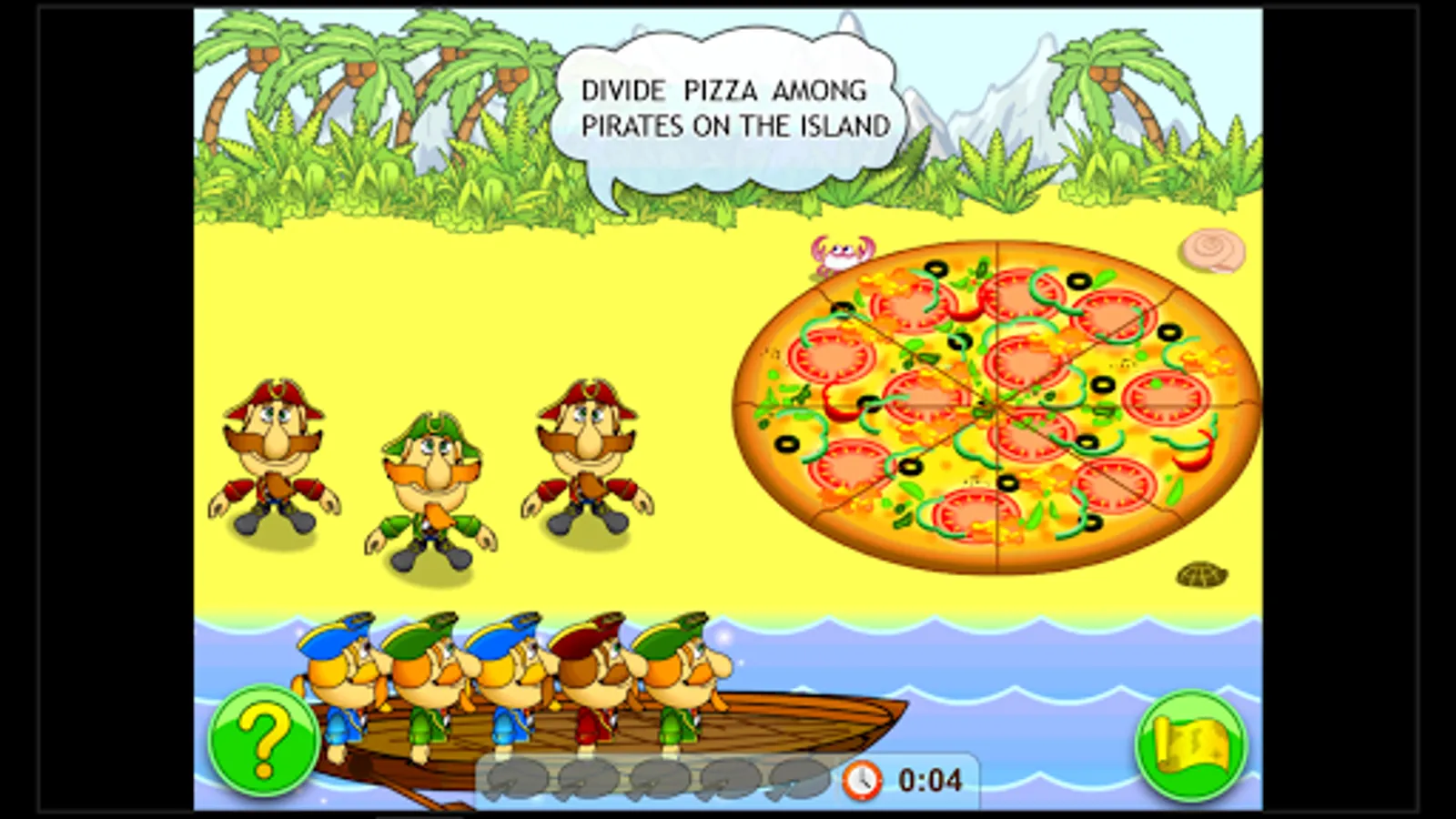 On the first island the player learns to read fractions. In order to do so he/she offers the pirates some slices of pizza and try to guess what part of the pizza is left for other pirates to eat in the boat. If there is a mistake the pirates get in trouble.