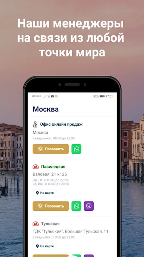 In addition, you are always welcome at any of our 8 Moscow offices. Sometimes, when ordering a voucher, personal communication with the manager is more preferable than through mobile communications. Using the application, you can organize such a meeting where a professional manager will select the best elite tour, taking into account all your wishes.