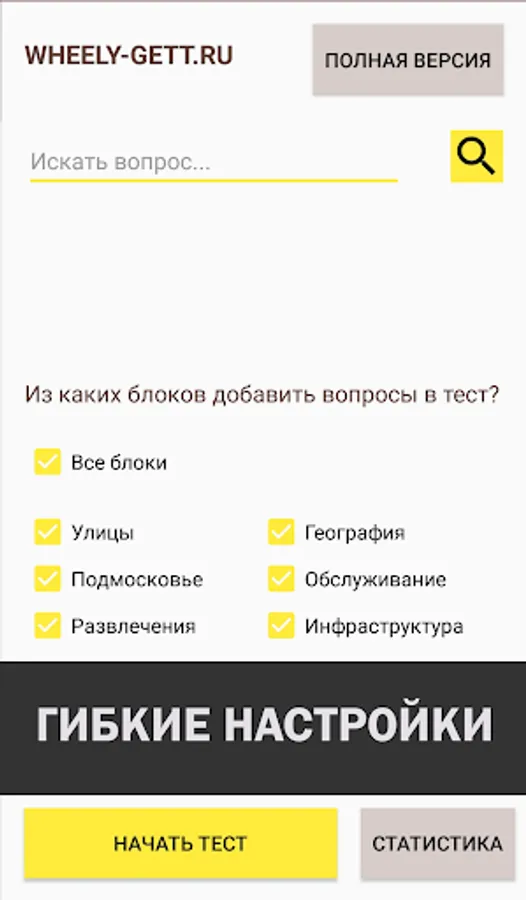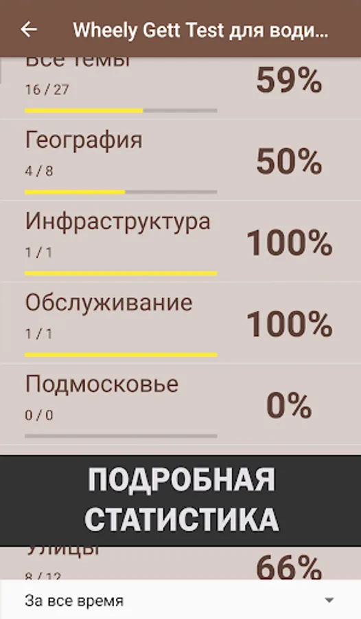 Keep track of your stats. For quick preparation, all questions regarding knowledge of working in a business taxi are divided into the following categories: Moscow geography, infrastructure, service standards for aggregator services (situational tests), Moscow Region, streets and entertainment. Choose the necessary blocks and take a test on them separately. So you will significantly improve your results on selected topics.