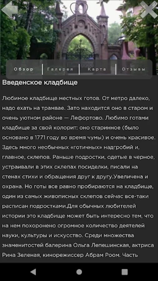 Our application combines not only a source of information for people interested in everything unknown, scary and interesting, but gives them the opportunity to share this information with users of the application. Moreover, an important part of the “It was scary” application is a place card containing a map with the place indicated on it, an address and exact geographical coordinates, as well as a description of the place or event and photographs. The themes of the places to be added at the moment are horrors, mysticism, the unknown, architecture (scary places) and abandoned places. Of course, the list of categories can be expanded, taking into account the needs of users. Also, a feature of the application is the ability to add stories, but not exclusively of an artistic nature, only real stories, although it is possible to add legends.