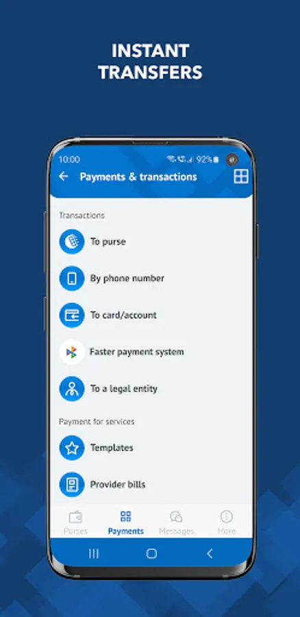 • Transfer funds via a mobile number to WebMoney users and Sberbank customers