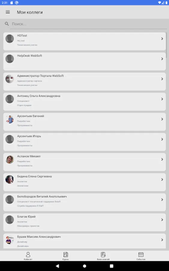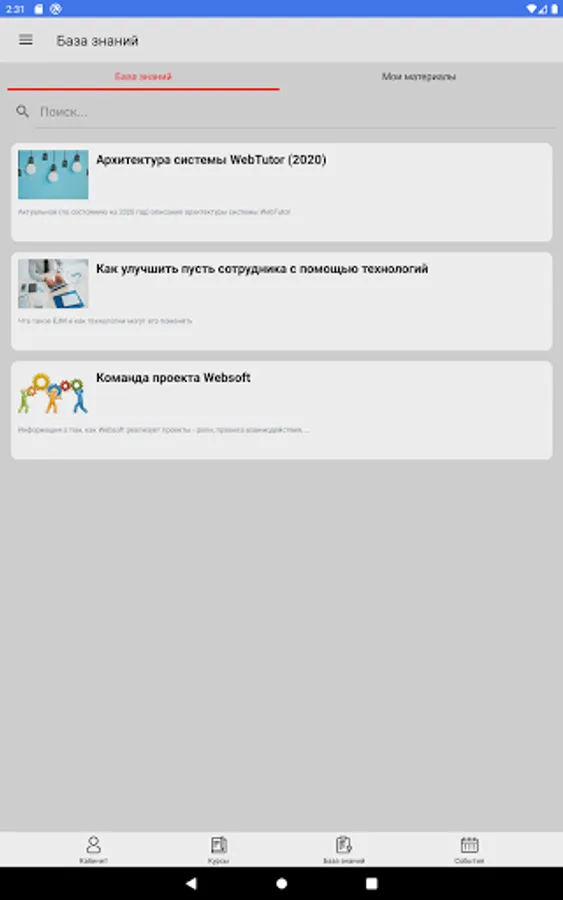 The application is designed to work with a knowledge base, a library of documents and training materials posted on the training portal created using the WebTutor system. By specifying the server address, username and password in the settings, the user can upload materials from the server to the application.