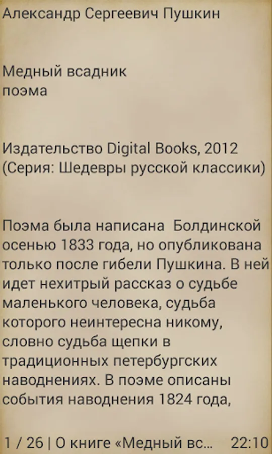 Publisher Digital Books popularizes works of classical literature and support new authors. We produce books in the form of applications for mobile devices based on the Android operating system. With a simple menu every reader can customize the display of books under the specifications of your device.