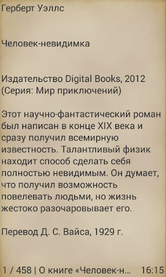 If you are an aspiring writer and would like to see his work in the form of applications for mobile devices based on the Android operating system, please contact the publisher Digital Books (webvo@webvo.ru or webvoru@gmail.com)