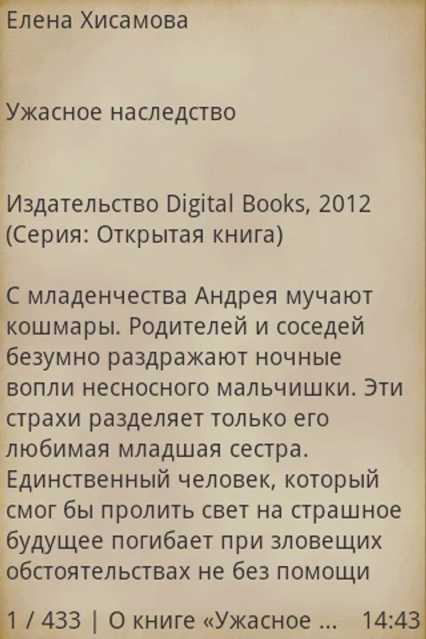 From infancy Andrew nightmares. Parents and neighbors insanely annoying nocturnal cries Breakfast with Scot. These fears are shared only his beloved younger sister. The only person who could shed light on the terrible future dies under sinister circumstances with the help of Andrew, although he was still not aware of the involvement of evil. Ancient tomes, he found in the attic of the house is inherited, launching a series of horrific events in the life of Andrew and his family. Will he be able to get rid of the curse and save the loved ones? What price will have to pay for the children's curiosity? Is Andrew Will destroy the offspring of hell, to pull them out of the brink of the unknown? How are the fate of three of his favorite women with terrible and mysterious events originating from the distant past? This you will learn by reading mystical novel "terrible legacy" Elena Khisamova.