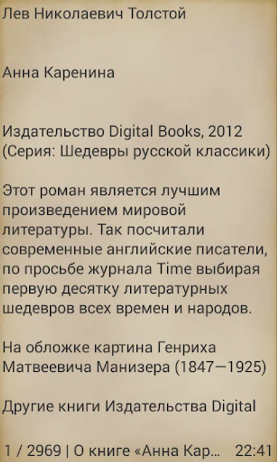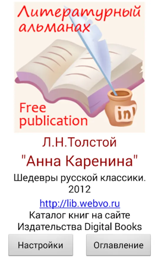Publisher Digital Books popularizes works of classical literature and support new authors. We produce books in the form of applications for mobile devices based on the Android operating system. With a simple menu every reader can customize the display of books under the specifications of your device.