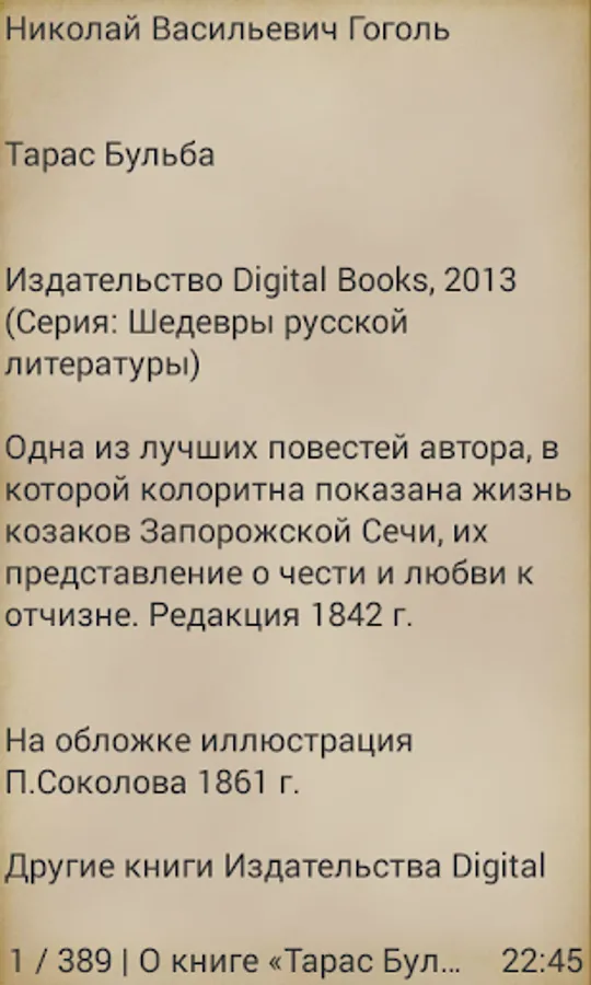 Publisher Digital Books popularizes works of classical literature and support new authors. We produce books in the form of applications for mobile devices based on the Android operating system. With a simple menu every reader can customize the display of books under the specifications of your device.