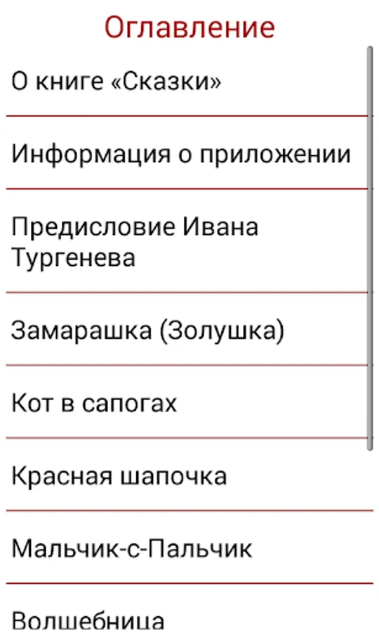 The collection includes the world famous fairy tales "Puss in Boots", "Little Red Riding Hood", "Bluebeard", "Sleeping Beauty" and others translated by Ivan Turgenev.