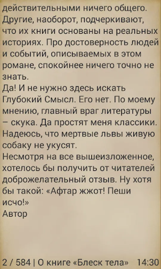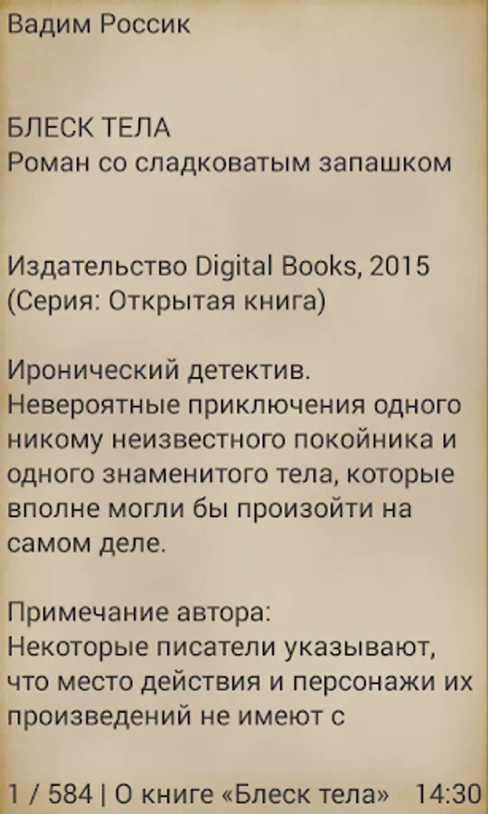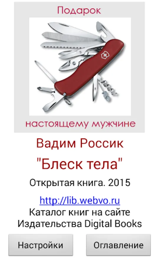 If you are an aspiring writer and would like to see his work in the form of applications for mobile devices based on the Android operating system, please contact the publisher Digital Books (webvo@webvo.ru or webvoru@gmail.com)