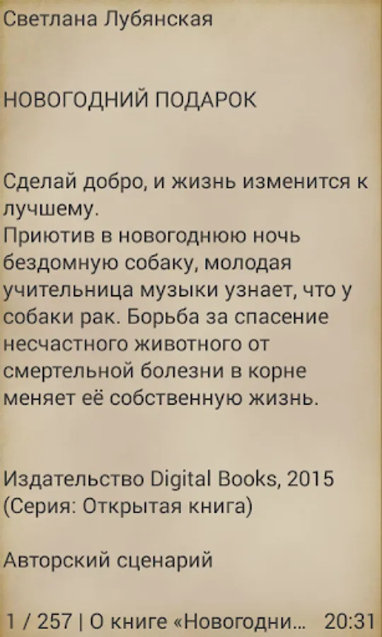 If you are an aspiring writer and would like to see his work in the form of applications for mobile devices based on the Android operating system, please contact the publisher Digital Books (webvo@webvo.ru or webvoru@gmail.com)