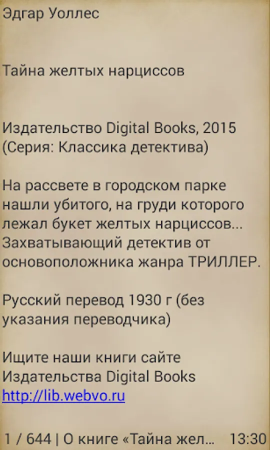 The Digital Books publishing house is engaged in the popularization of works of classical literature and the support of novice authors. We publish books in the form of applications for mobile devices based on the Android operating system. Using a simple menu, each reader can customize the display of the book to the characteristics of their device.