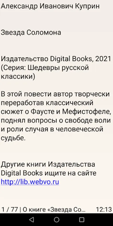 Digital Books is dedicated to popularizing classical literature and supporting aspiring authors. We publish books as applications for mobile devices based on the Android operating system. Using a simple menu, each reader can customize the display of the book to the characteristics of his device.