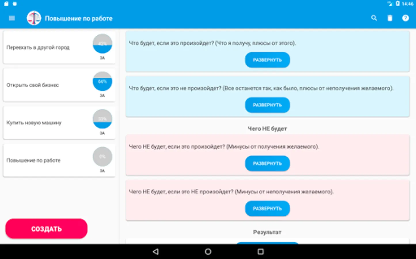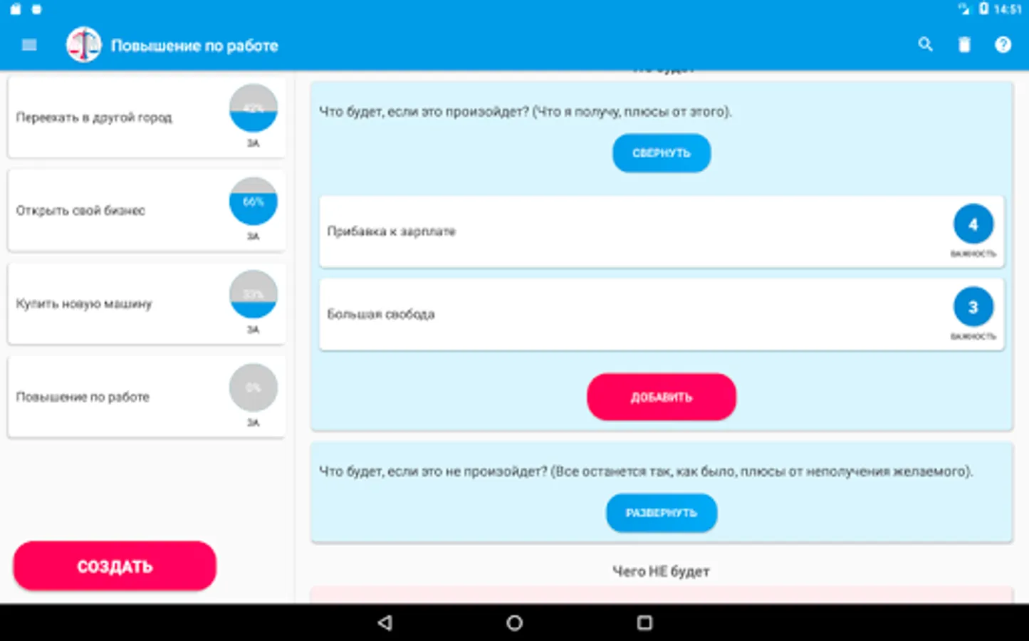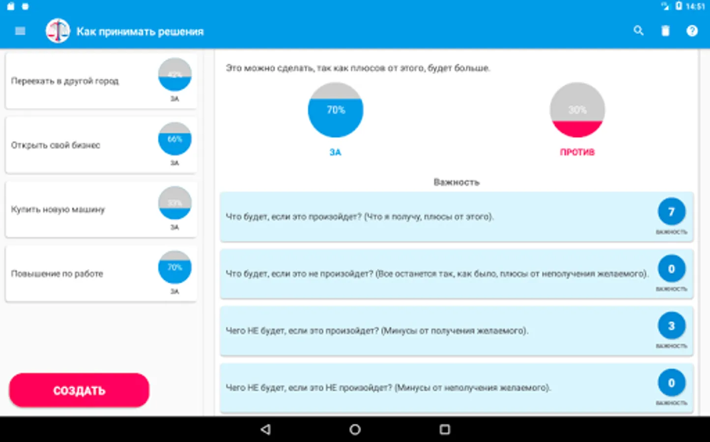 Application for Android "How to Decide" - A square of Descartes as a technique to make decisions is extremely simple, which requires for its use a very small amount of time. With the help of Descartes' Square easily set the most important selection criteria, as well as to evaluate the effect of any options to make decisions.