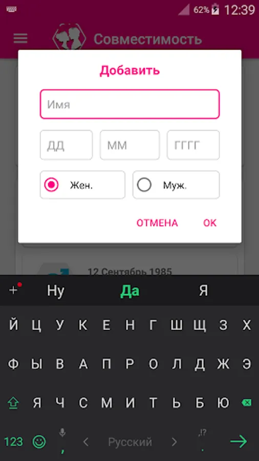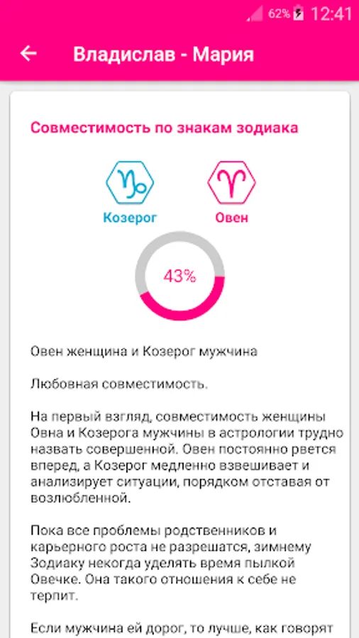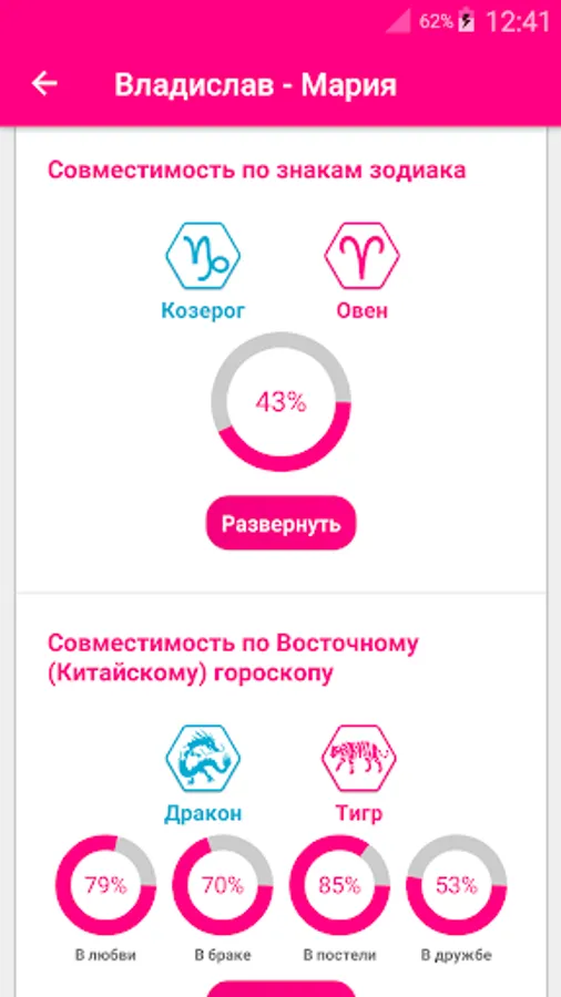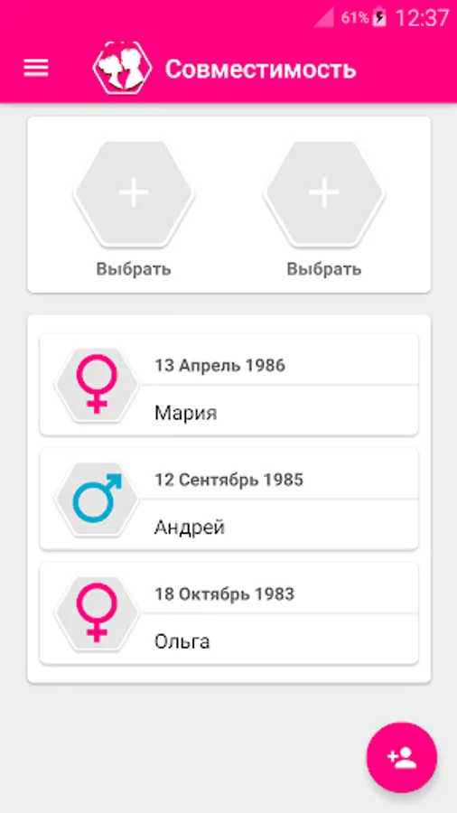 With the application you can find out compatibility in love. You simply add a person and the application calculates the compatibility of a man and a woman in love or find out compatibility in friendship.