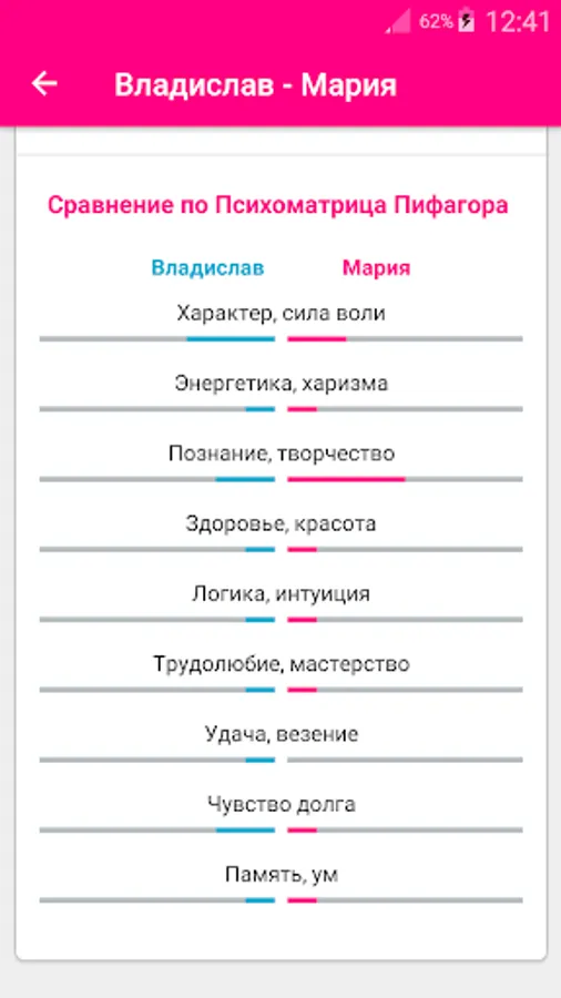 Using the Pythagorean Psychomatrix comparison, you can compare the following indicators with a partner and find out compatibility in love: