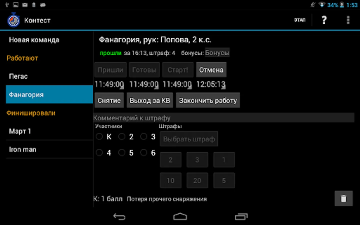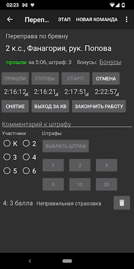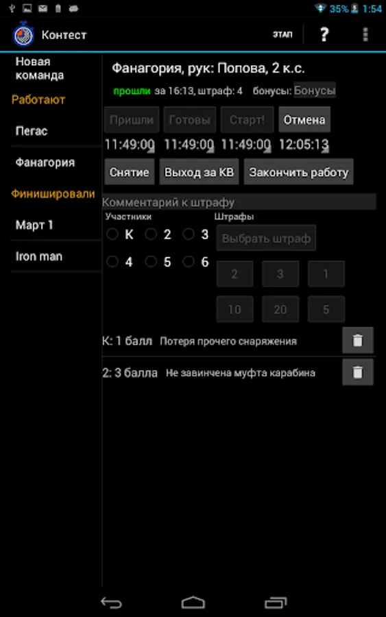 - to set penalties for participants, both arbitrary and from the chosen system of penalties, using only those that are applicable to a particular stage