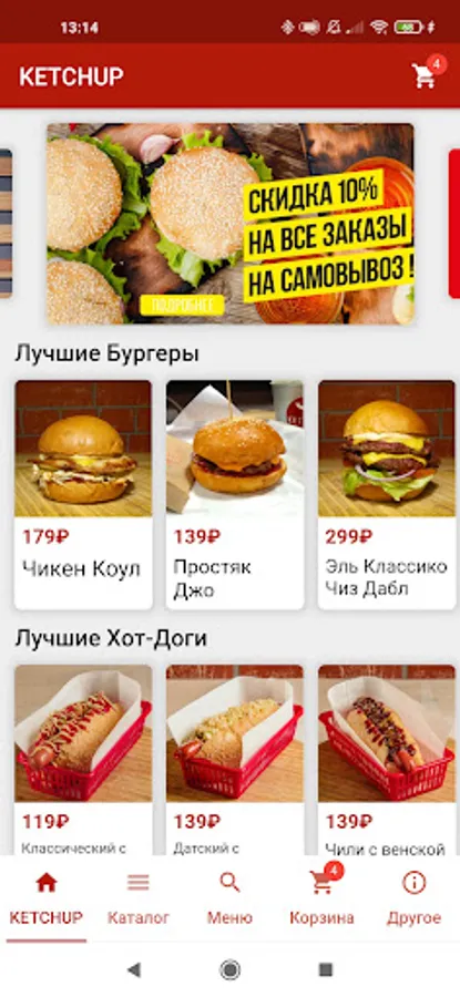 Mobile application "KETCHUP CAFE". Burger and Hot Dog Delivery "is an easy and fast way to order delivery of amazing juicy burgers and real hot dogs from KETCHUP CAFE in Yoshkar-Ola. We also deliver great snacks and specialty drinks.