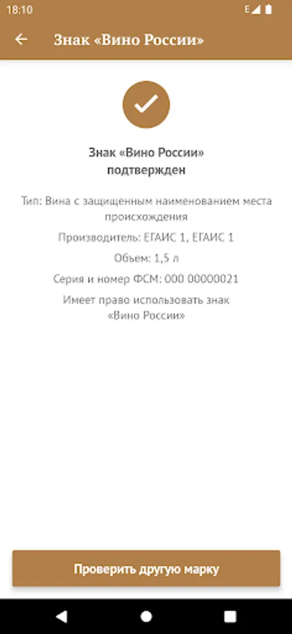 This application allows any user to determine whether the winemaker had the right to place the sign "Wine of Russia" on the wine he produces.