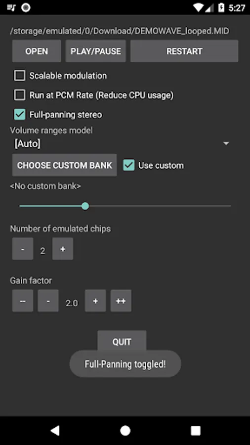 It's a small and simple MIDI player with OPN2 (Yamaha YM2612) or OPNA (YM2608) FM synthesis. The player can play any MIDI, MUS, or XMI file you will have on your device. Player has General-MIDI and Semi-XG compatible bank timbre bank made from imported instruments from various Sega Megadrive/Genesis games, ported from OPL3, or originally made. Optionally you can use external timbre bank file in WOPN to get the different sounding of your music.