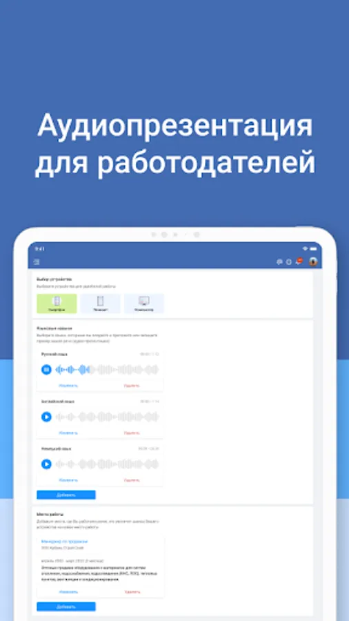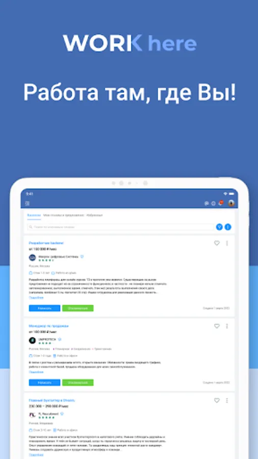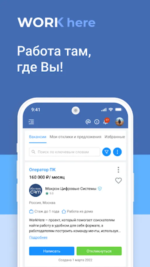 WorkHere is a professional tool for quickly finding employees for your team. In the application you will find an extensive database of qualified candidates from various fields: sales, IT, marketing / advertising, administrative staff, finance, accounting and many others. New candidates are registered daily!