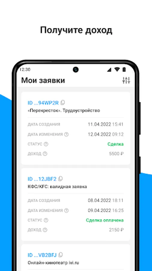 Withdraw your income to a bank card or account in just 5 banking days. Our earning application ensures the stability of payments: everything is simple, transparent and official! We want each user to feel safe, and also to receive additional income without worries.