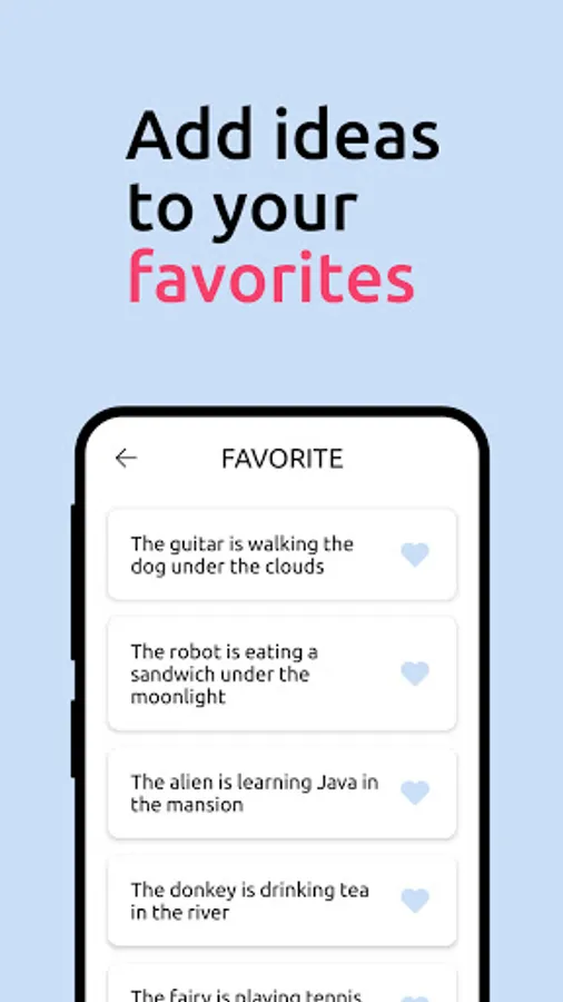 Simple, stylish and comfortable design will make using the app more pleasant. You've got no inspiration, but you don’t want to lose an idea? Add it to the favorites and come back later. Quickly and easily share ideas with your friends directly in the app.