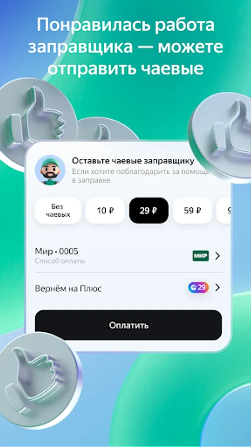 Gas stations where you can pay for fuel in the application are indicated by green dots. When you arrive at such a gas station, select the column number in the card. Then select the type of fuel, how much you want to refuel and the payment method. Click "Pay" - the fuel will flow, and when the refueling runs out, you can leave. If something goes wrong, a message appears on the screen about what needs to be done.