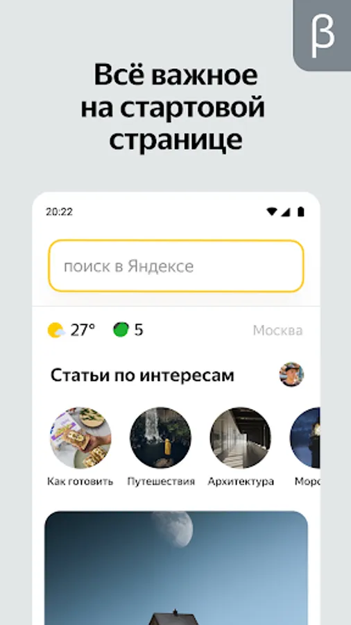 Be the first to try out the new features of the Yandex Start mobile app - download the beta version of the app and join the testing! If you already have the Yandex Start mobile application installed, you do not need to uninstall it: the beta version is installed separately and does not interfere with the operation of the main application.